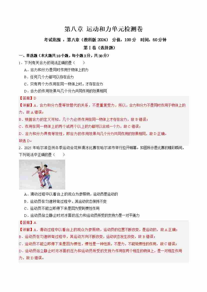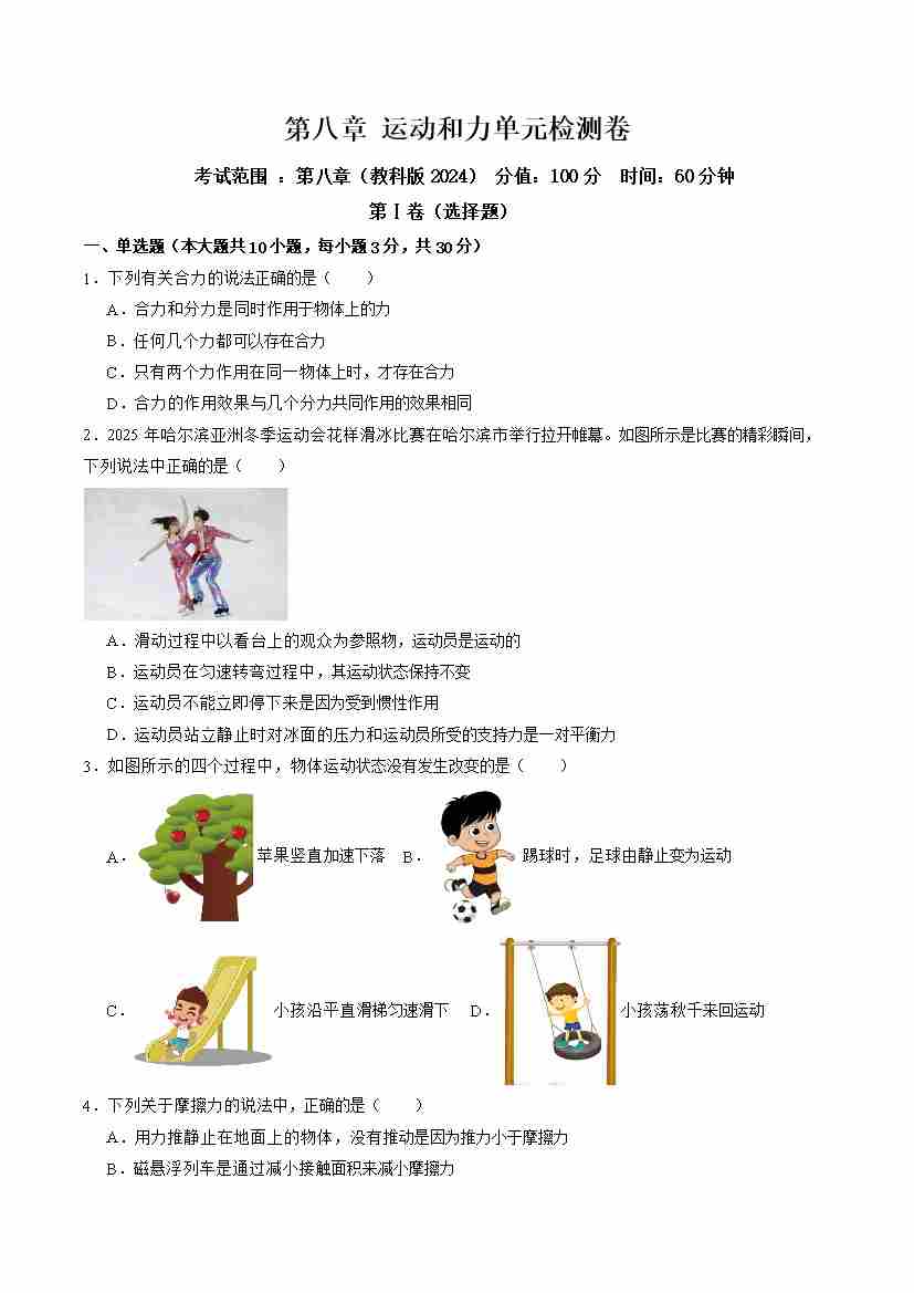 8.4力改变物体的运动状态(分层练习)(原卷版)