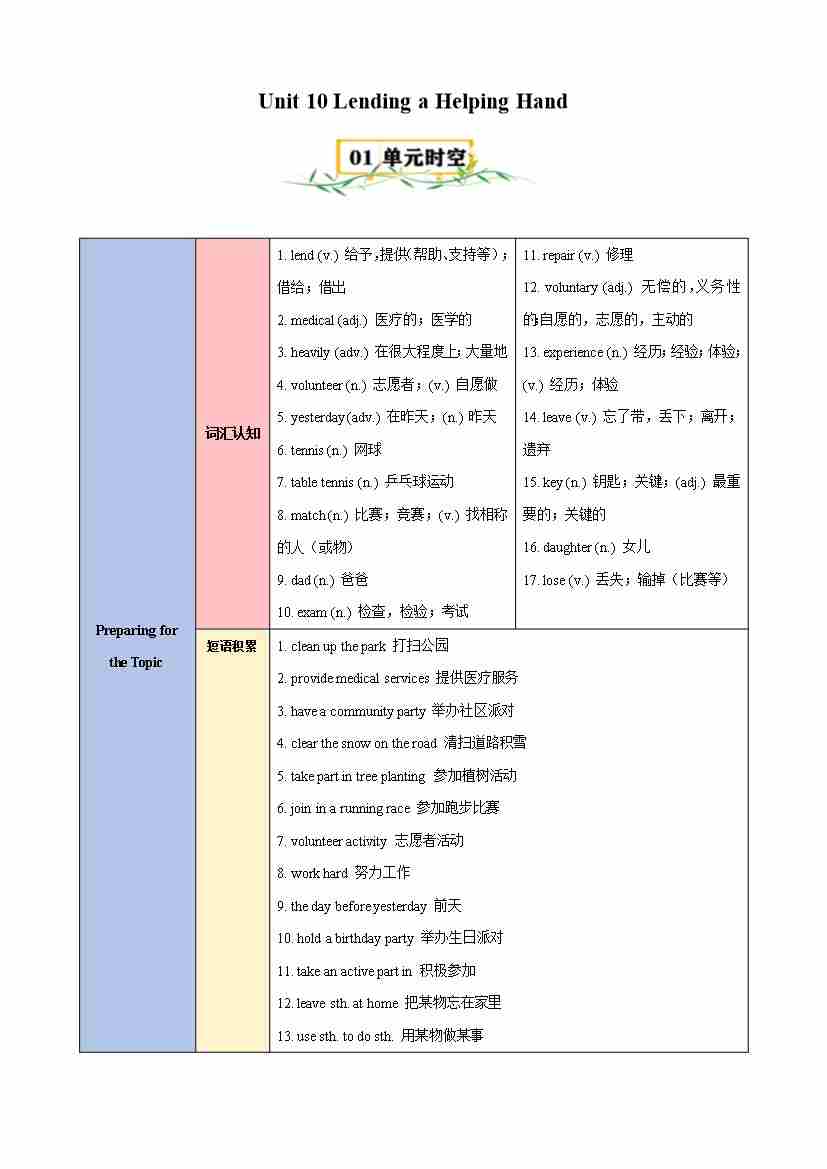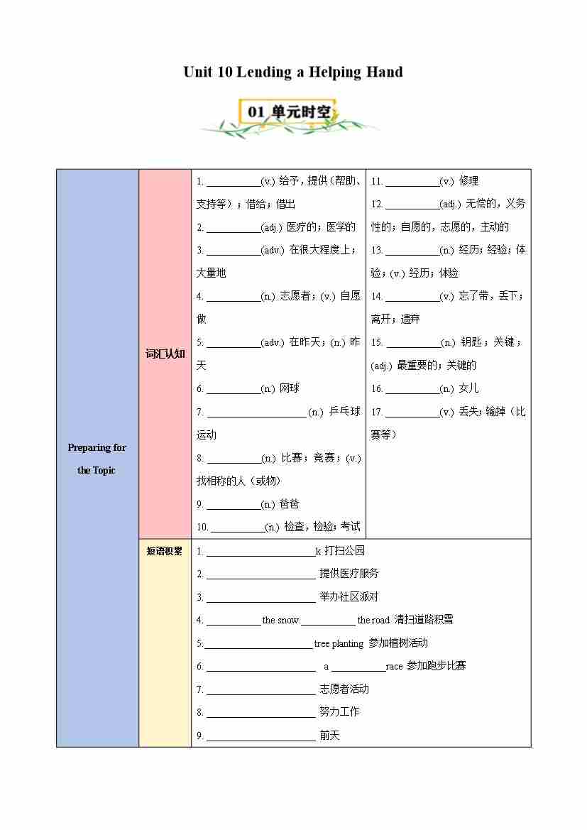Unit 10 Lending a Helping Hand(知识清单)(仁爱版)(教师版)