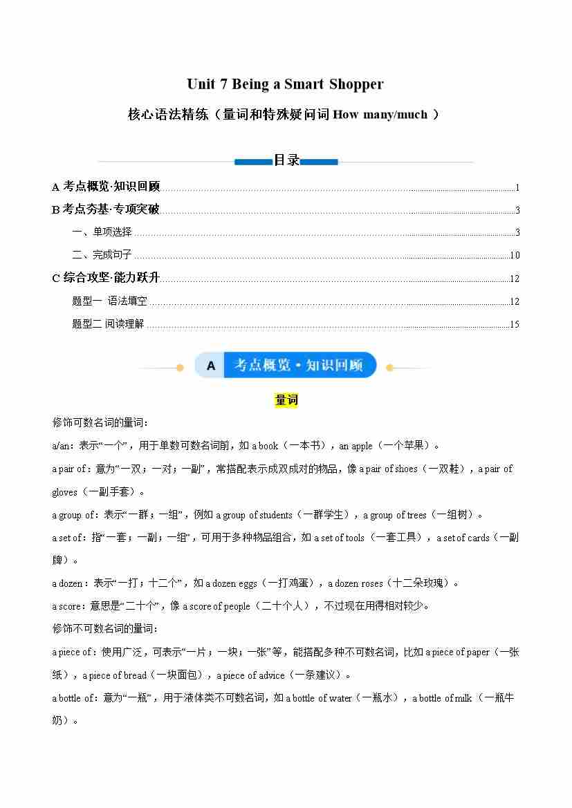 Unit 7 Being a Smart Shopper 量词和特殊疑问词How many和much(单元核心语法精练)(解析版)