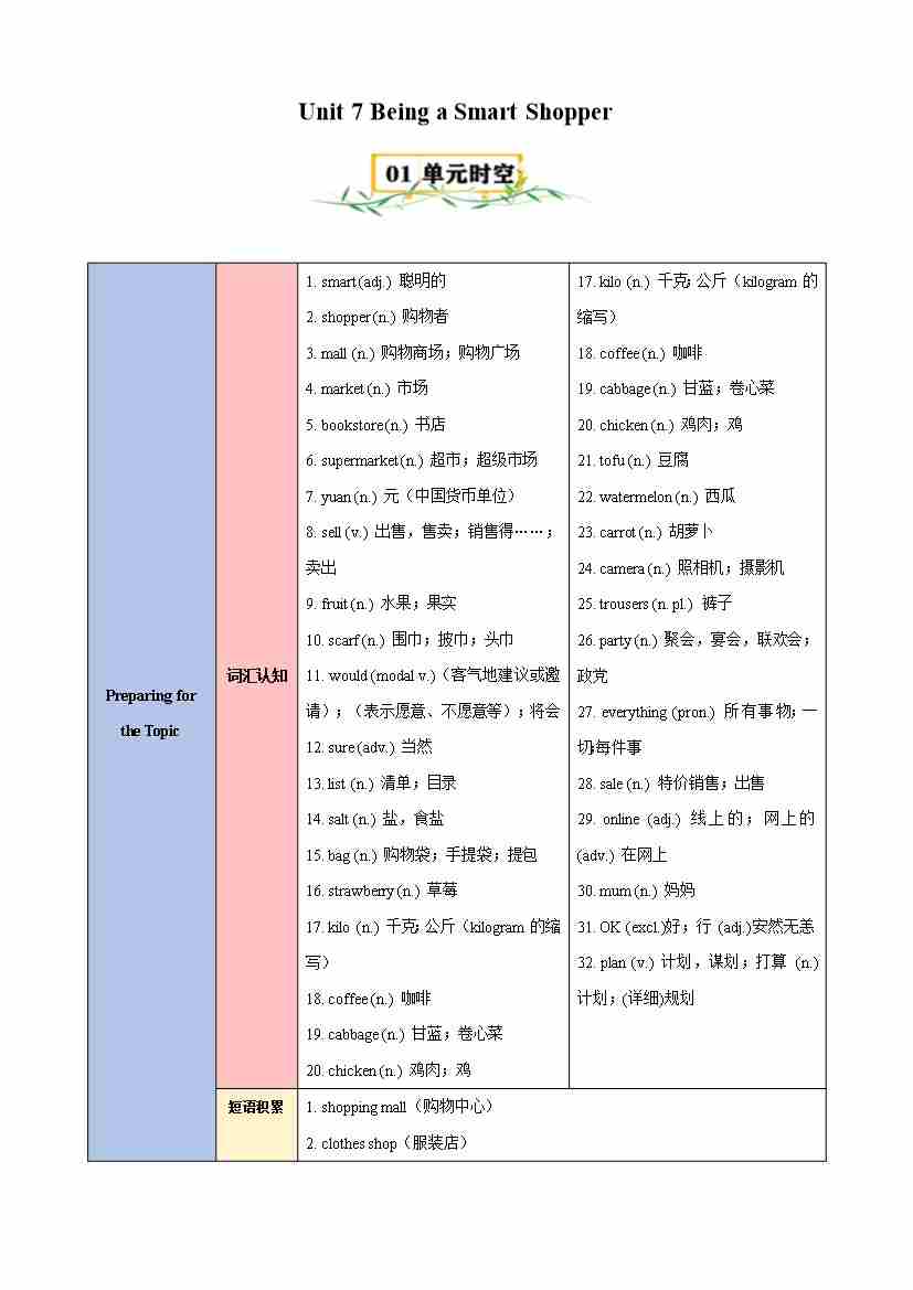Unit 7 Being a Smart Shopper(知识清单)(原卷版)