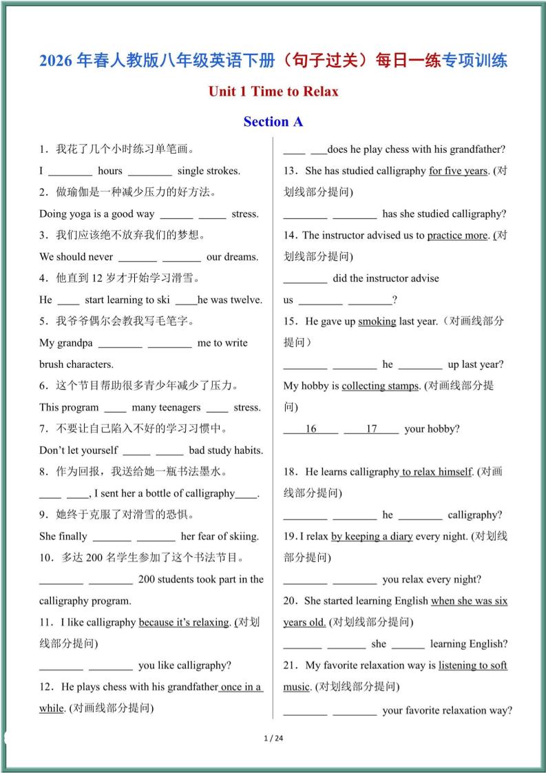 2026年春人教版八年级英语下册(句子过关)专项训练 含答案