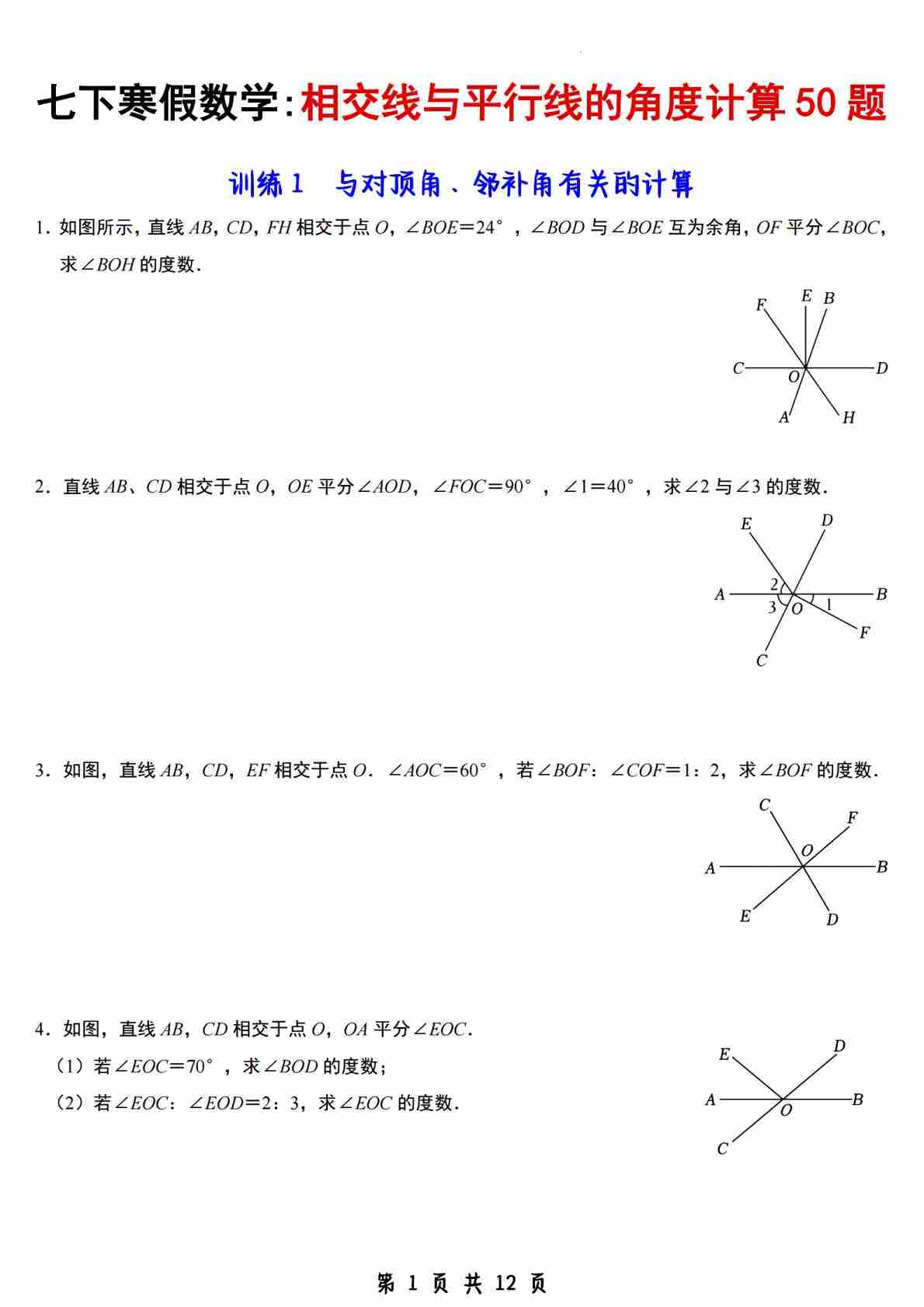 七下数学寒假相交线与平行线的角度计算50题