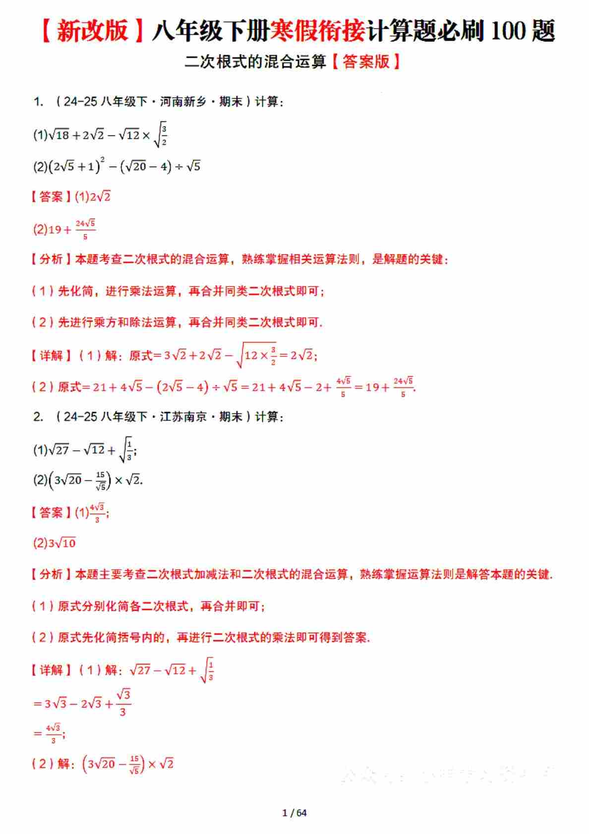 新改版八年级下册数学寒假衔接计算题必刷100题 答案解析