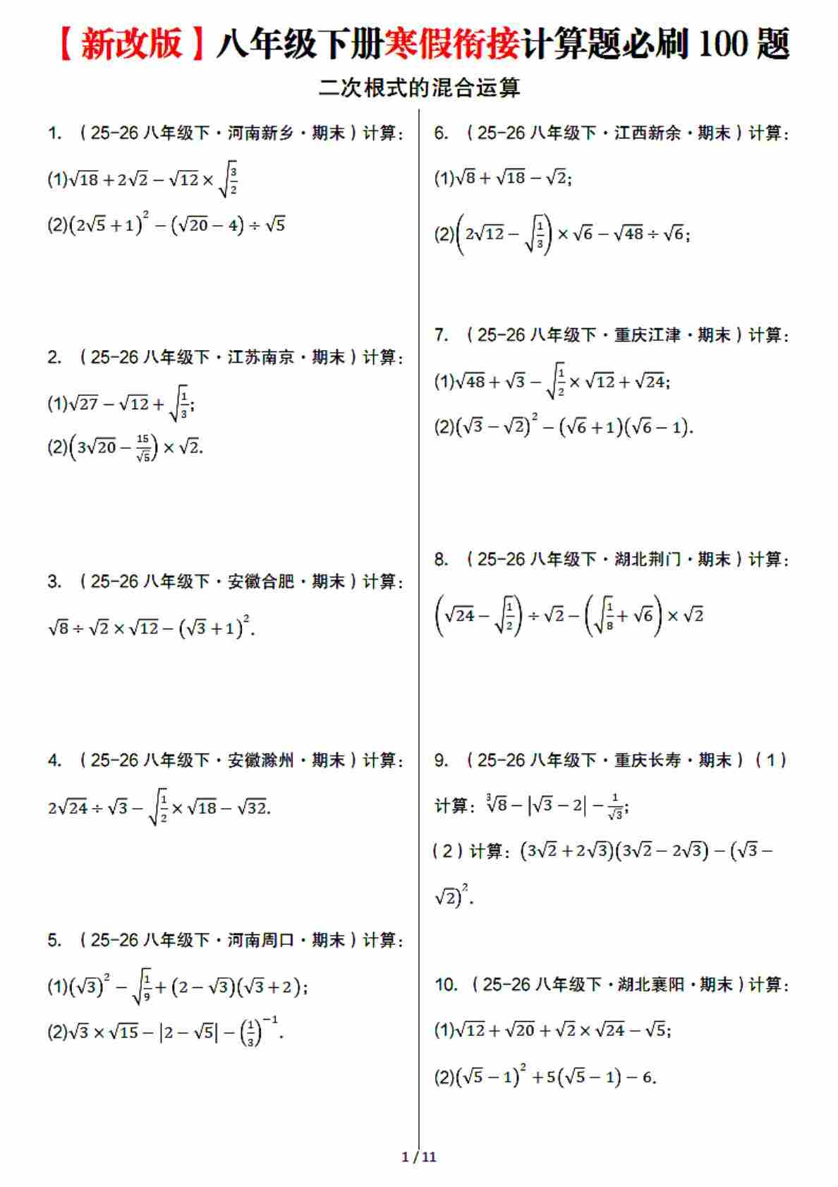 新改版八年级下册数学寒假衔接计算题必刷100题