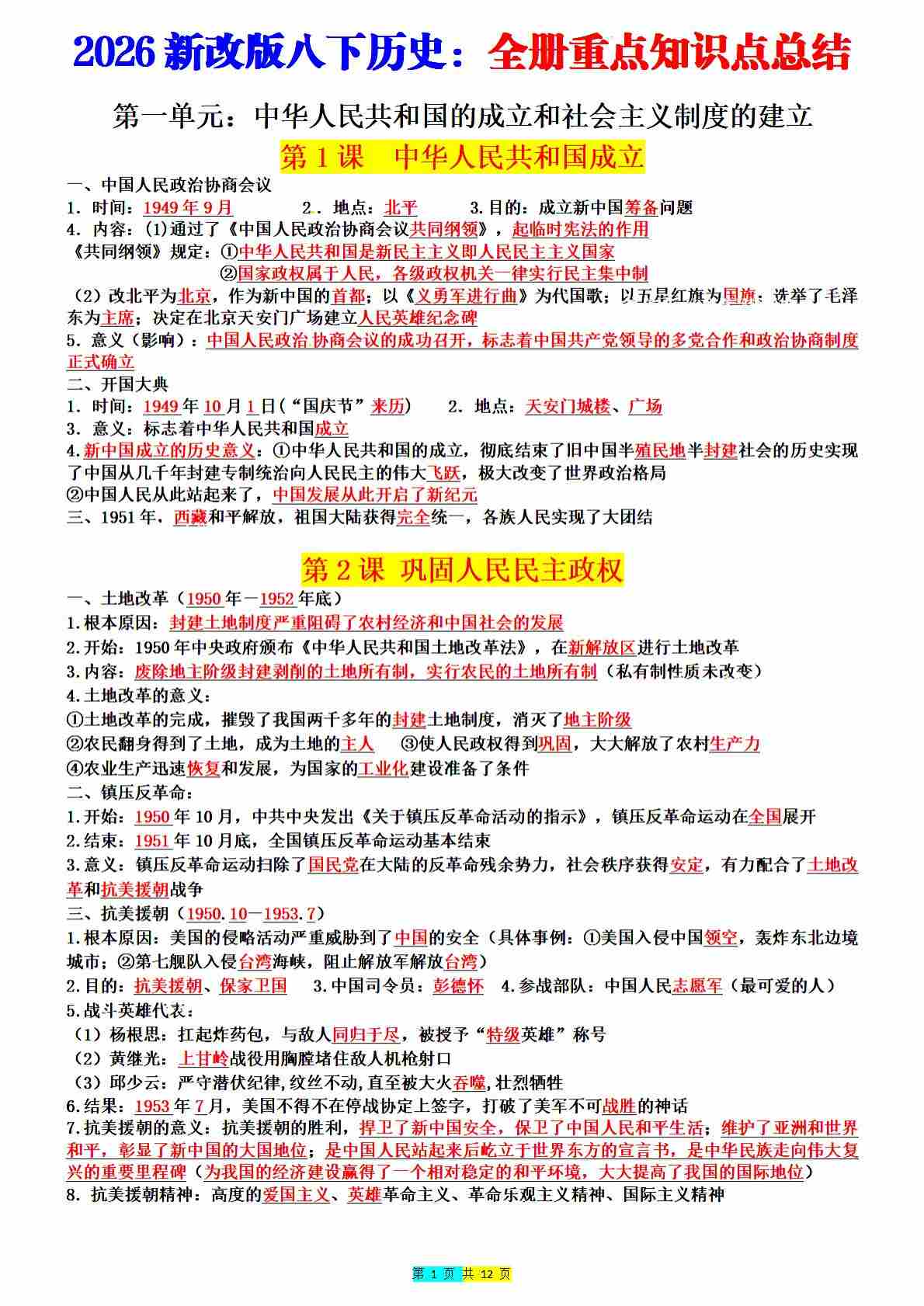 2026年八下历史全册重点知识点总结