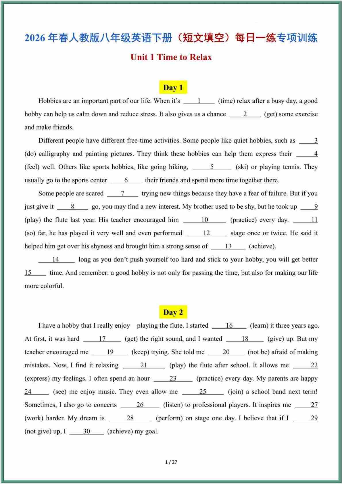 26年春人教版八年级英语下册(短文填空)每日一练 含答案