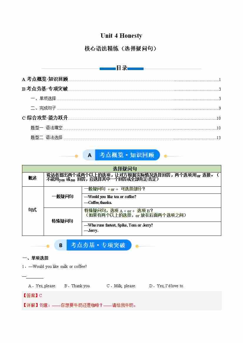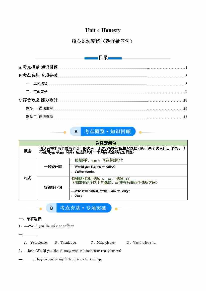 Unit 4 Honesty 选择疑问句(单元核心语法精练)(教师版)