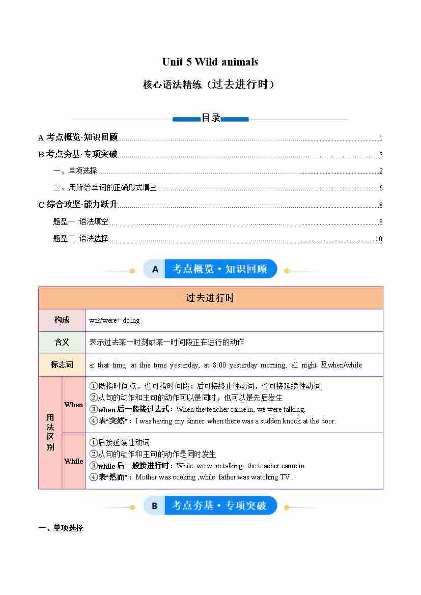 Unit 5 Wild animals 过去进行时(单元核心语法精练)(学生版)