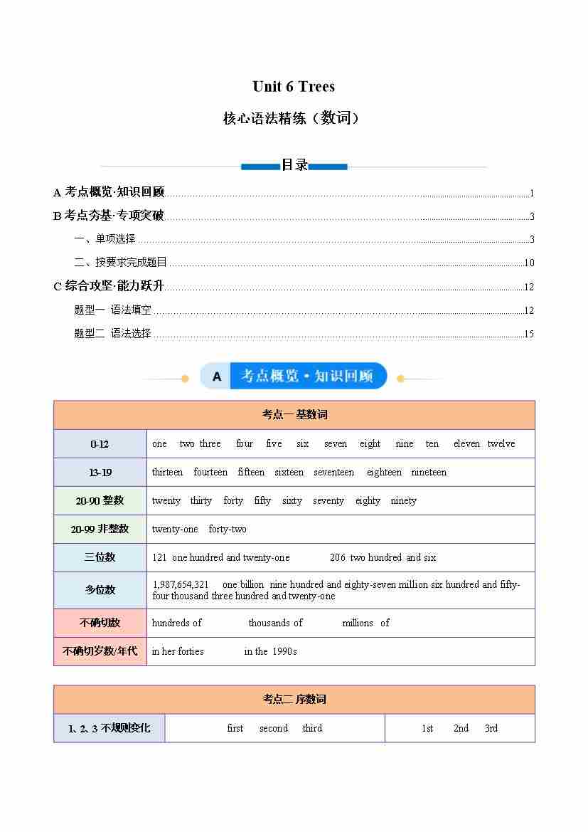 Unit 6 Trees 数词(单元核心语法精练)(教师版)