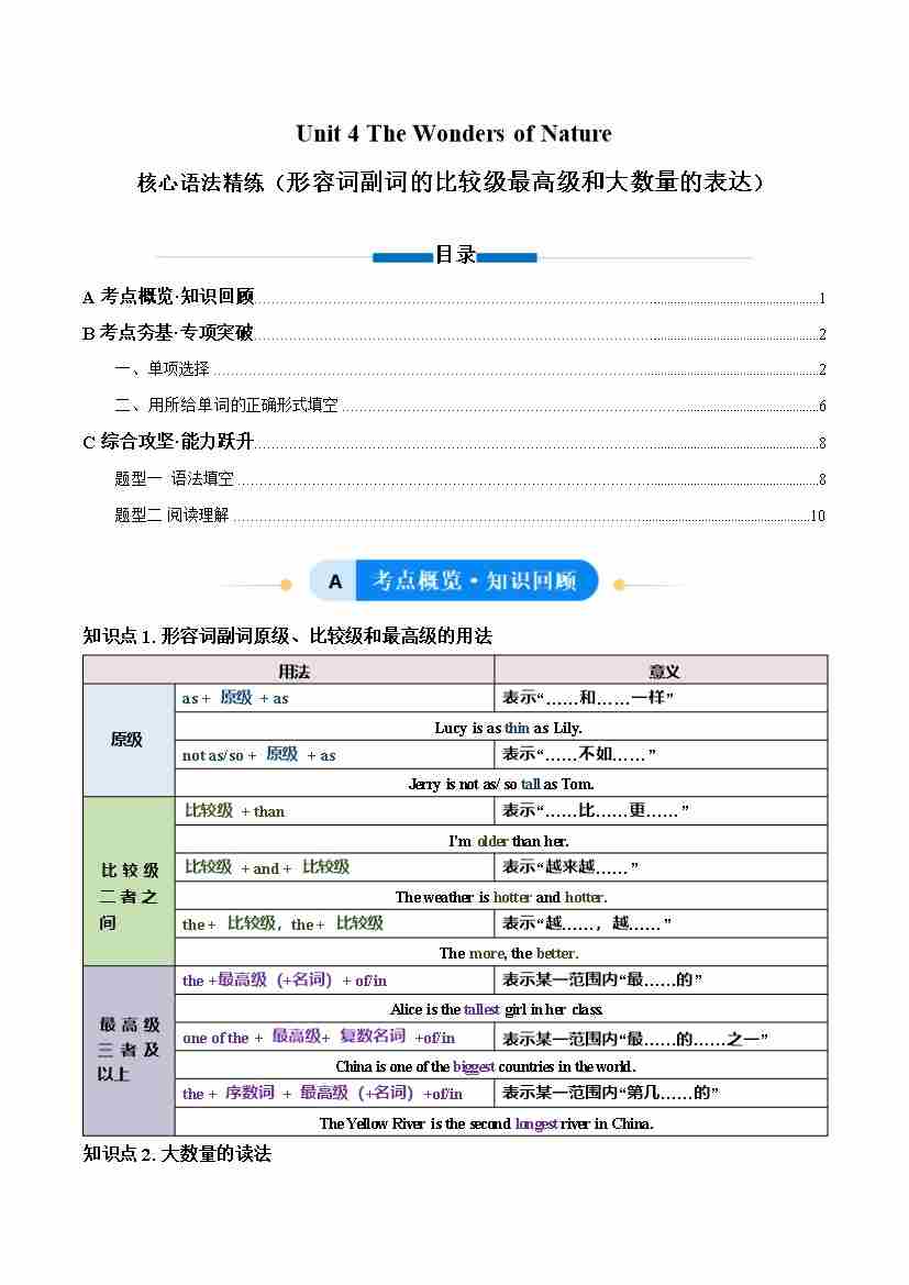 Unit 4 The Wonders of Nature 形容词副词的比较级最高级和大数量的表达(单元核心语法精练)(原卷版)