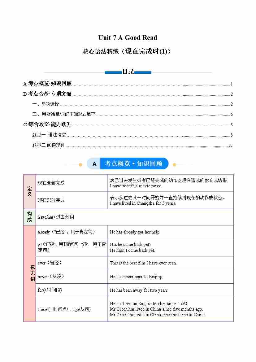 Unit 7 A Good Read 现在完成时(1)(单元核心语法精练)(解析版)