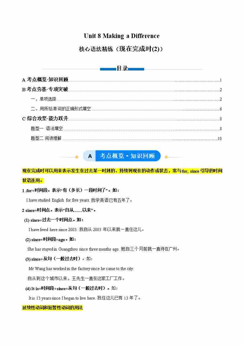 Unit 8 Making a Difference 现在完成时(2)(单元核心语法精练)(解析版)