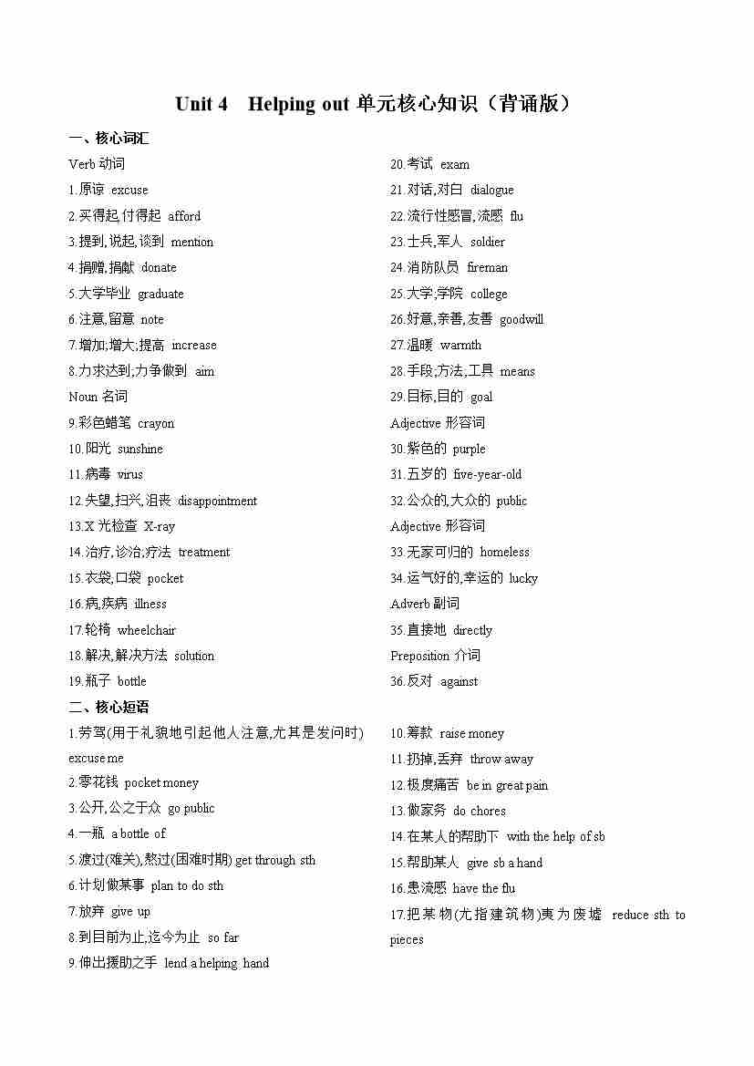 Unit 4 Helping out 单元核心知识(背诵默写任务单)(背诵版)