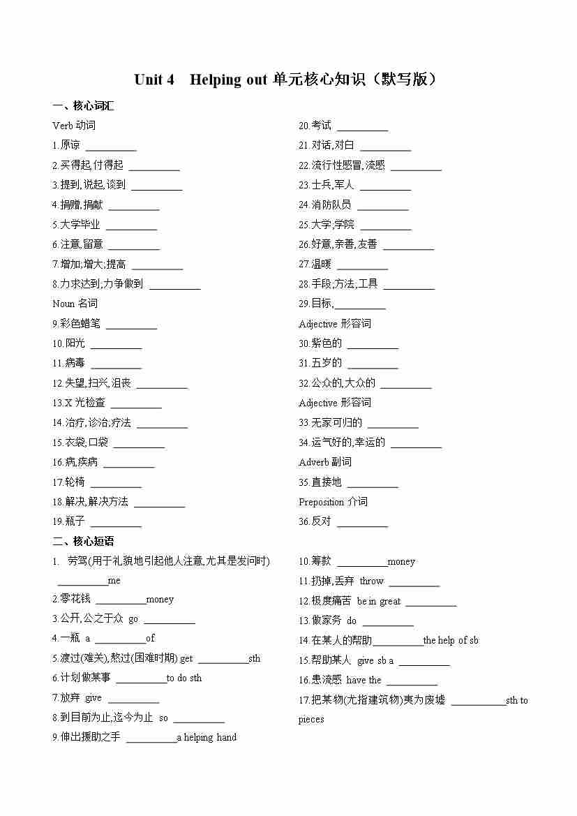 Unit 4 Helping out 单元核心知识(背诵默写任务单)(默写版)