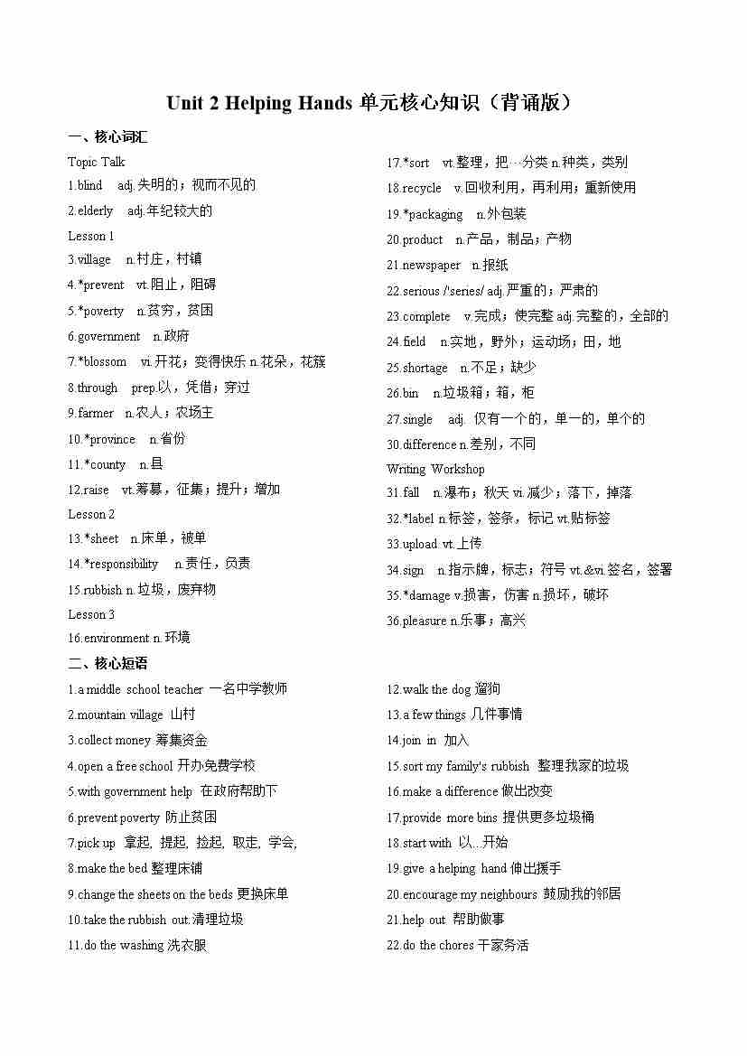 Unit2 Helping Hands 单元核心知识(背诵默写任务单)(背诵版)