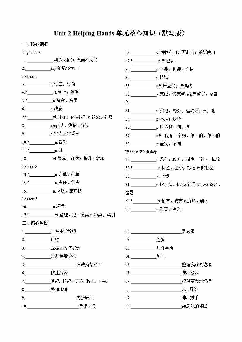 Unit2 Helping Hands 单元核心知识(背诵默写任务单)(默写版)