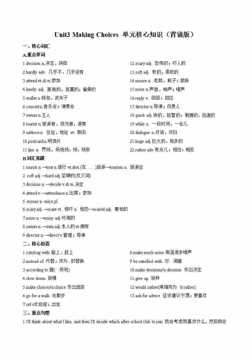 Unit3 Making Choices 单元核心知识(背诵默写任务单)(背诵版)