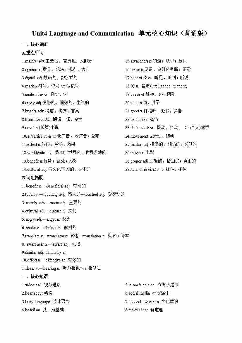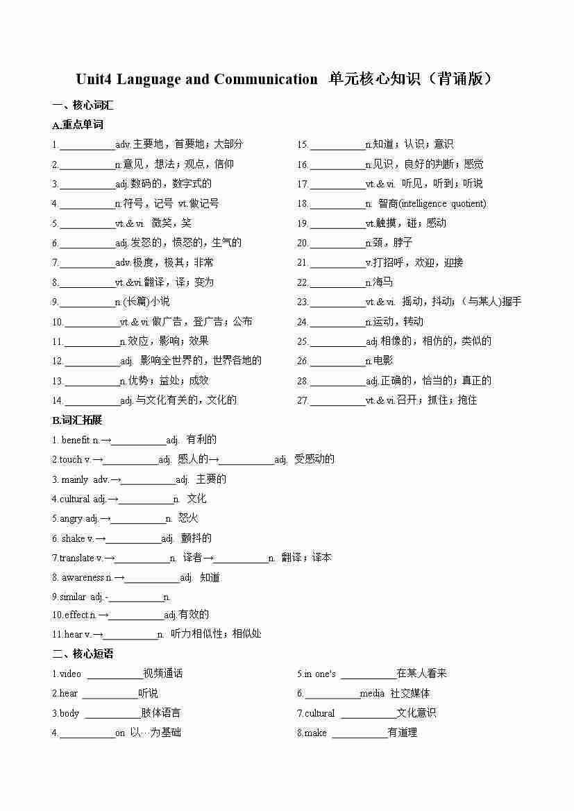 Unit4 Language and Communication 单元核心知识(背诵默写任务单)(背诵版)