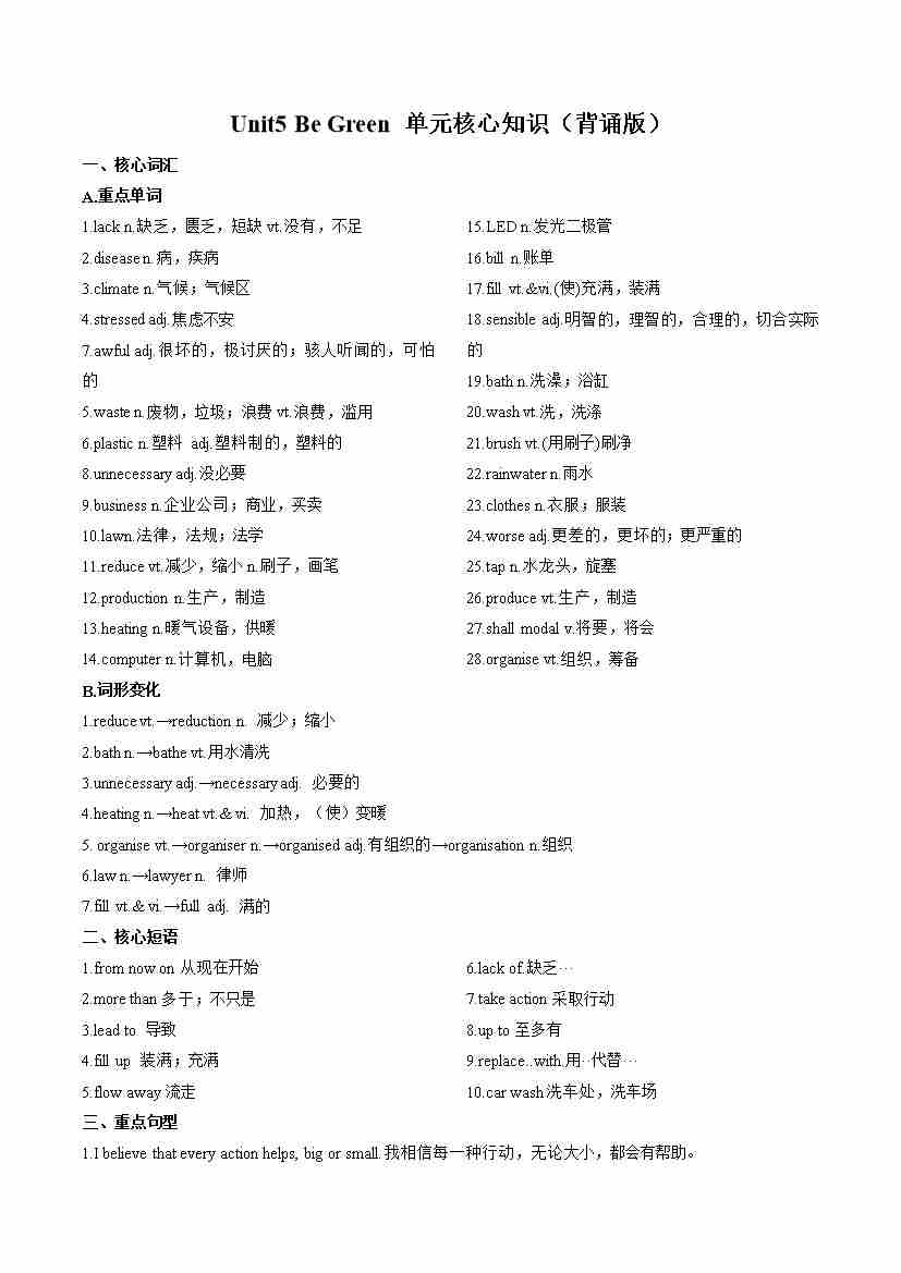 Unit5 Be Green 单元核心知识(背诵默写任务单)(背诵版)