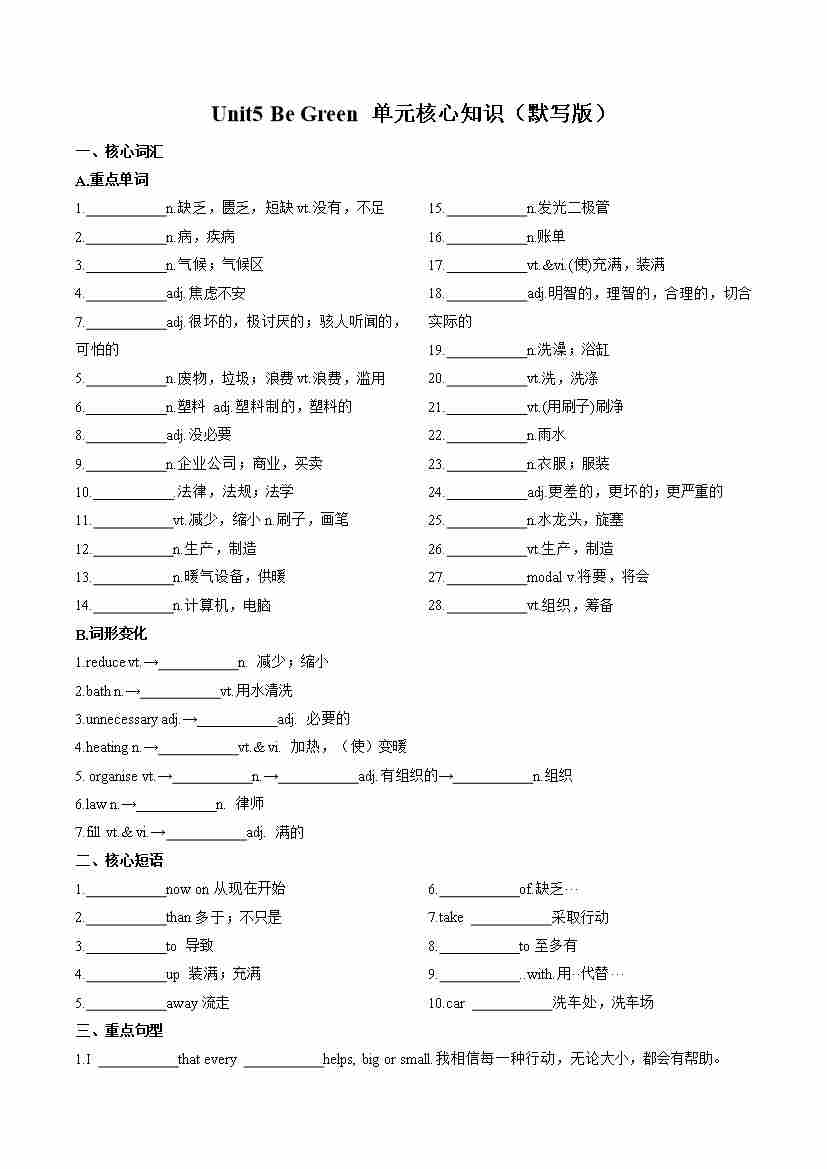 Unit5 Be Green 单元核心知识(背诵默写任务单)(默写版)