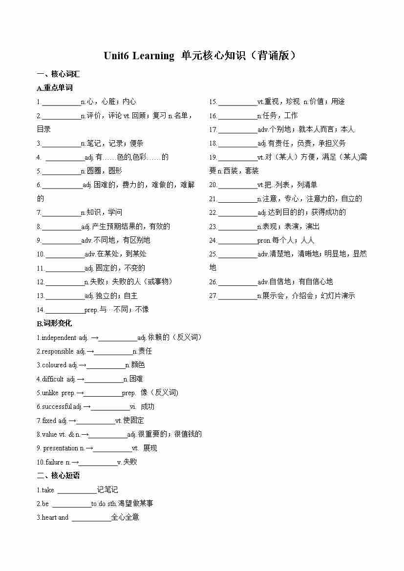 Unit6 Learning 单元核心知识(背诵默写任务单)(默写版)