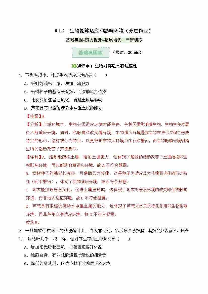 8.1.2 生物能够适应和影响环境(分层作业)(解析版)