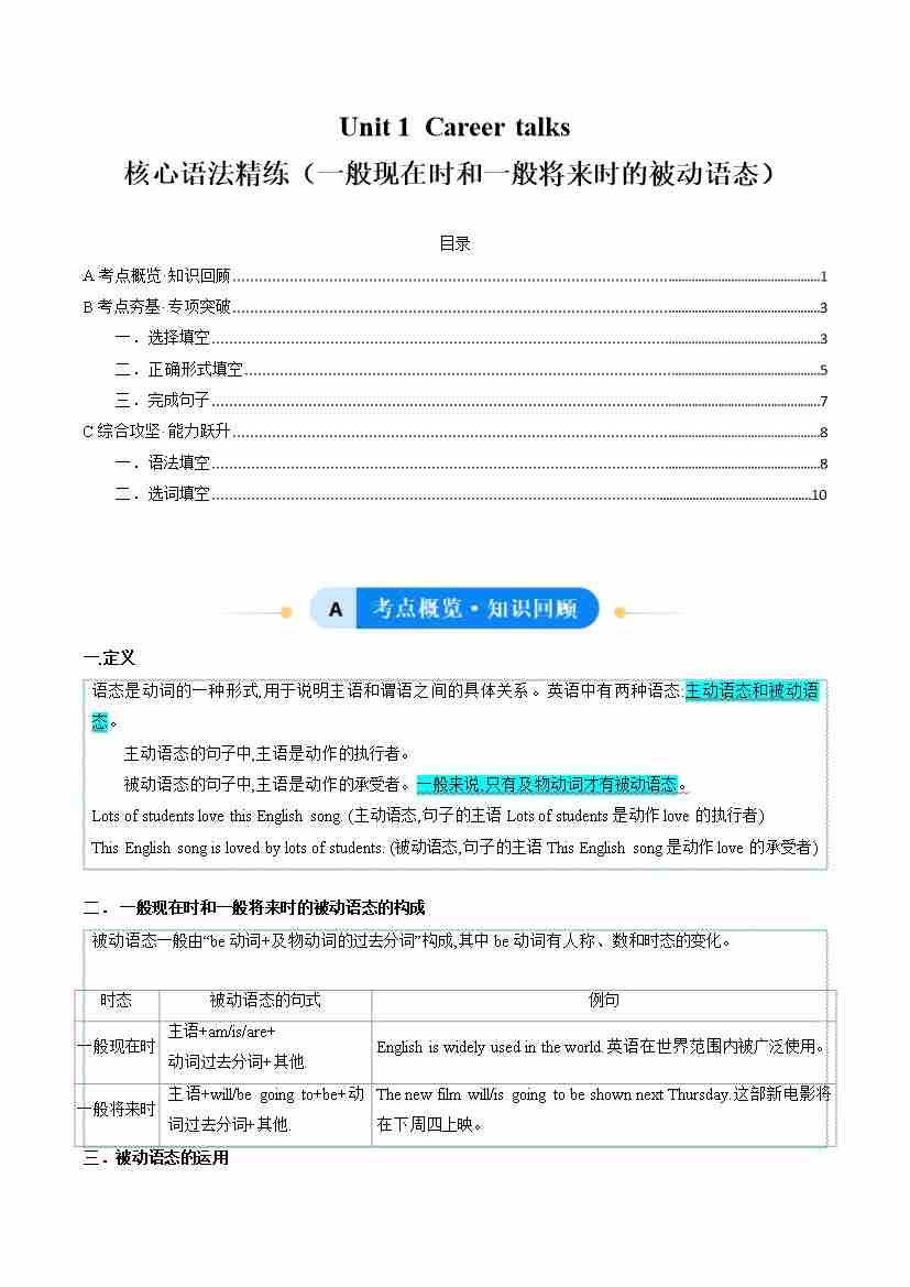 Unit 1 Career talks 一般现在时和一般将来时的被动语态(单元核心语法精练)(解析版)