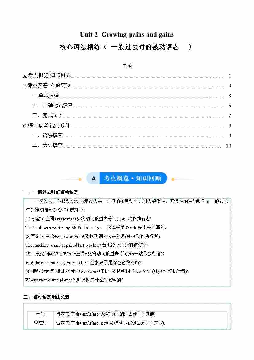 Unit 2 Growing pains and gains 一般过去时的被动语态(单元核心语法精练)(原卷版)