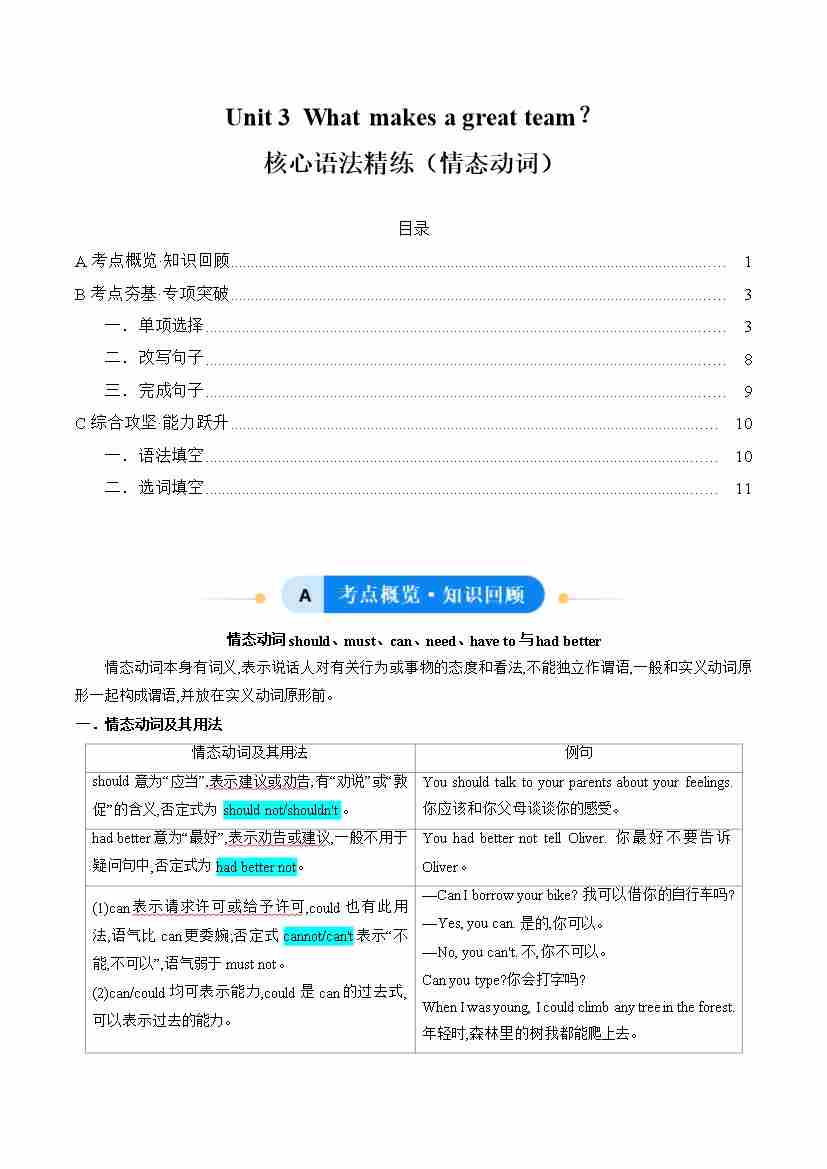 Unit 3 What makes a great team?情态动词(单元核心语法精练)(原卷版)