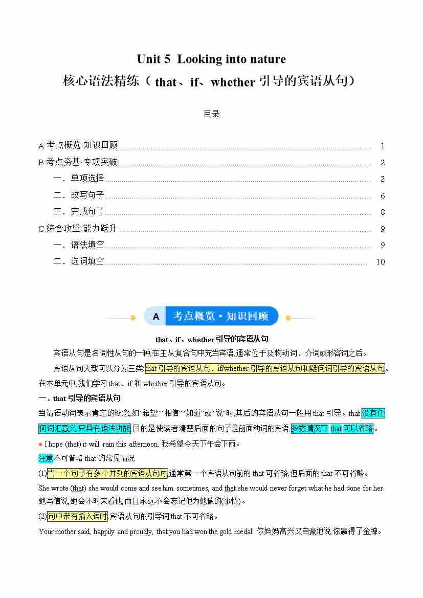 Unit 5 Looking into nature(that、if、whether引导的宾语从句)(单元核心语法精练)(解析版)
