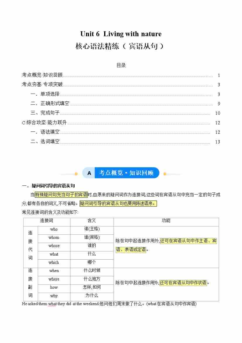 Unit 6 Living with nature宾语从句(单元核心语法精练)(原卷版)