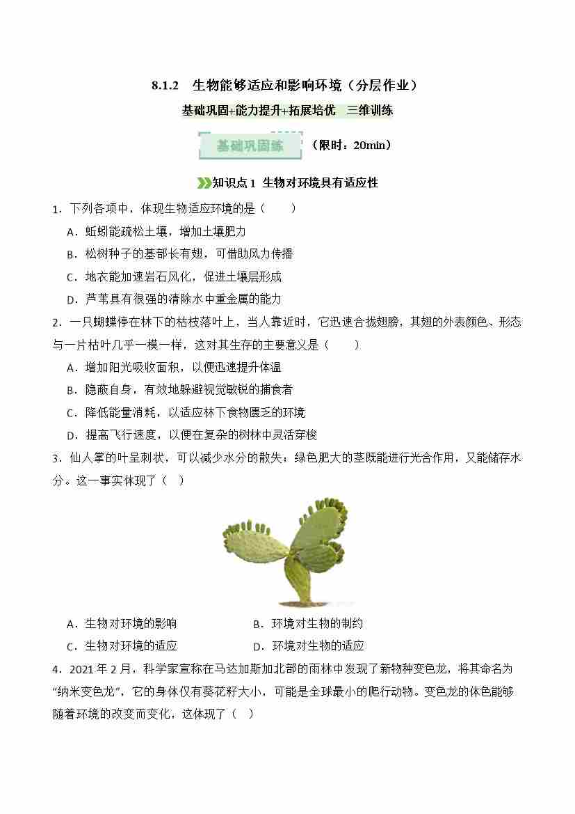 8.1.2 生物能够适应和影响环境(分层作业)(原卷版)
