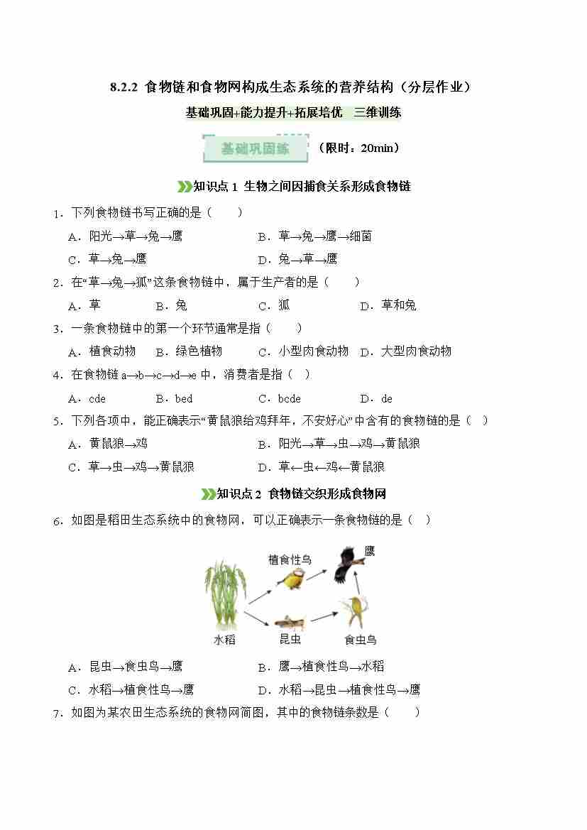 8.2.2 食物链和食物网构成生态系统的营养结构(分层作业)(原卷版)