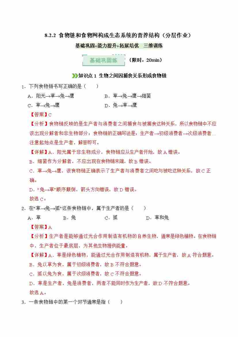 8.2.2 食物链和食物网构成生态系统的营养结构(分层作业)(解析版)