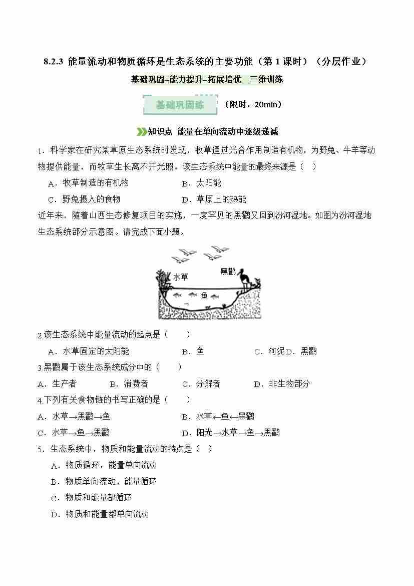 8.2.3 能量流动和物质循环是生态系统的主要功能 第1课时(分层作业)(原卷版)