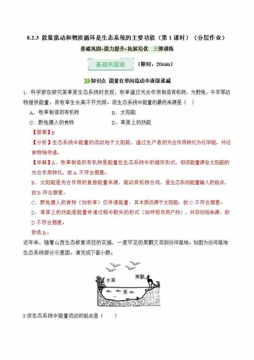 8.2.3 能量流动和物质循环是生态系统的主要功能 第1课时(分层作业)(解析版)