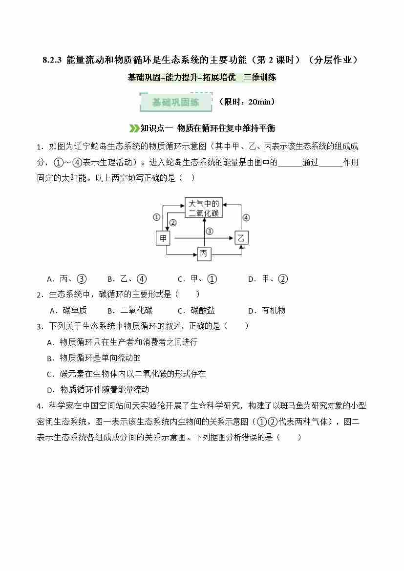 8.2.3 能量流动和物质循环是生态系统的主要功能 第2课时(分层作业)(原卷版)