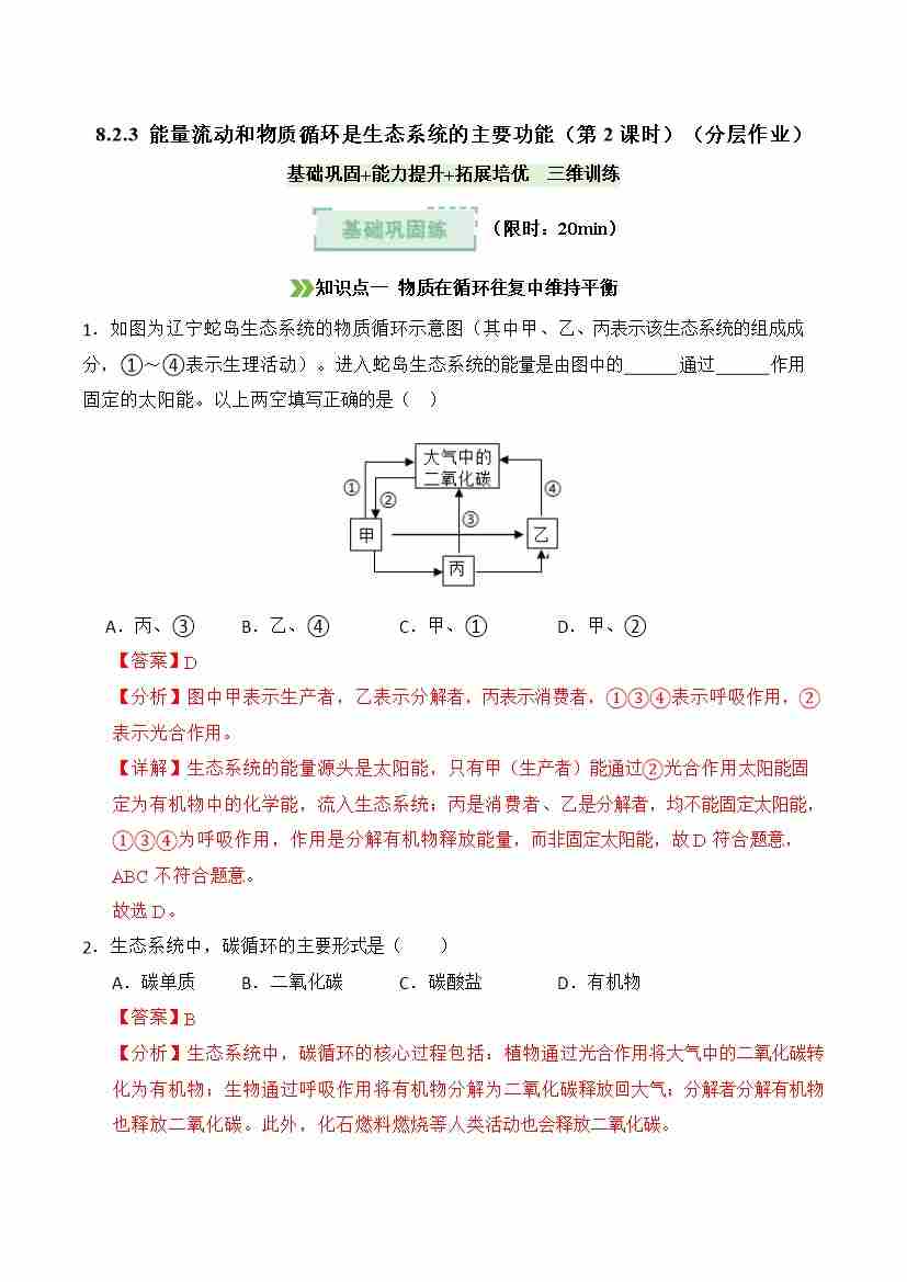 8.2.3 能量流动和物质循环是生态系统的主要功能 第2课时(分层作业)(解析版)