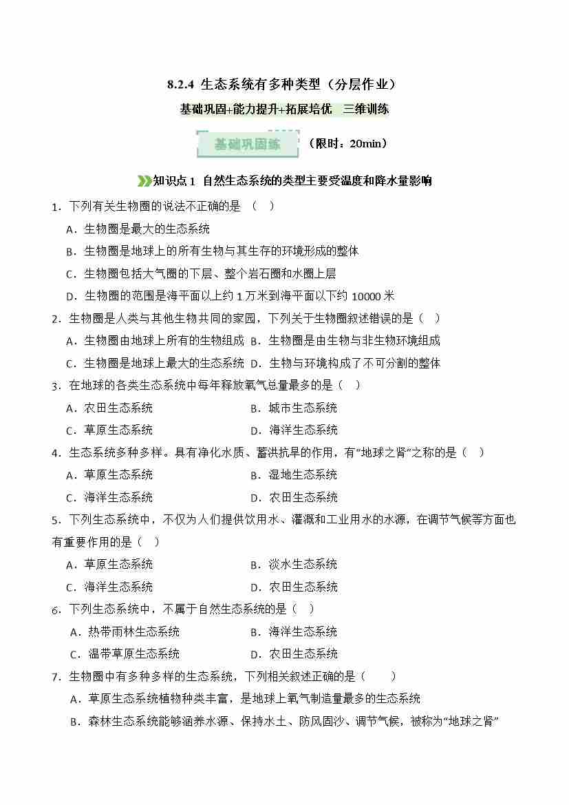8.2.4 生态系统有多种类型(分层作业)(原卷版)