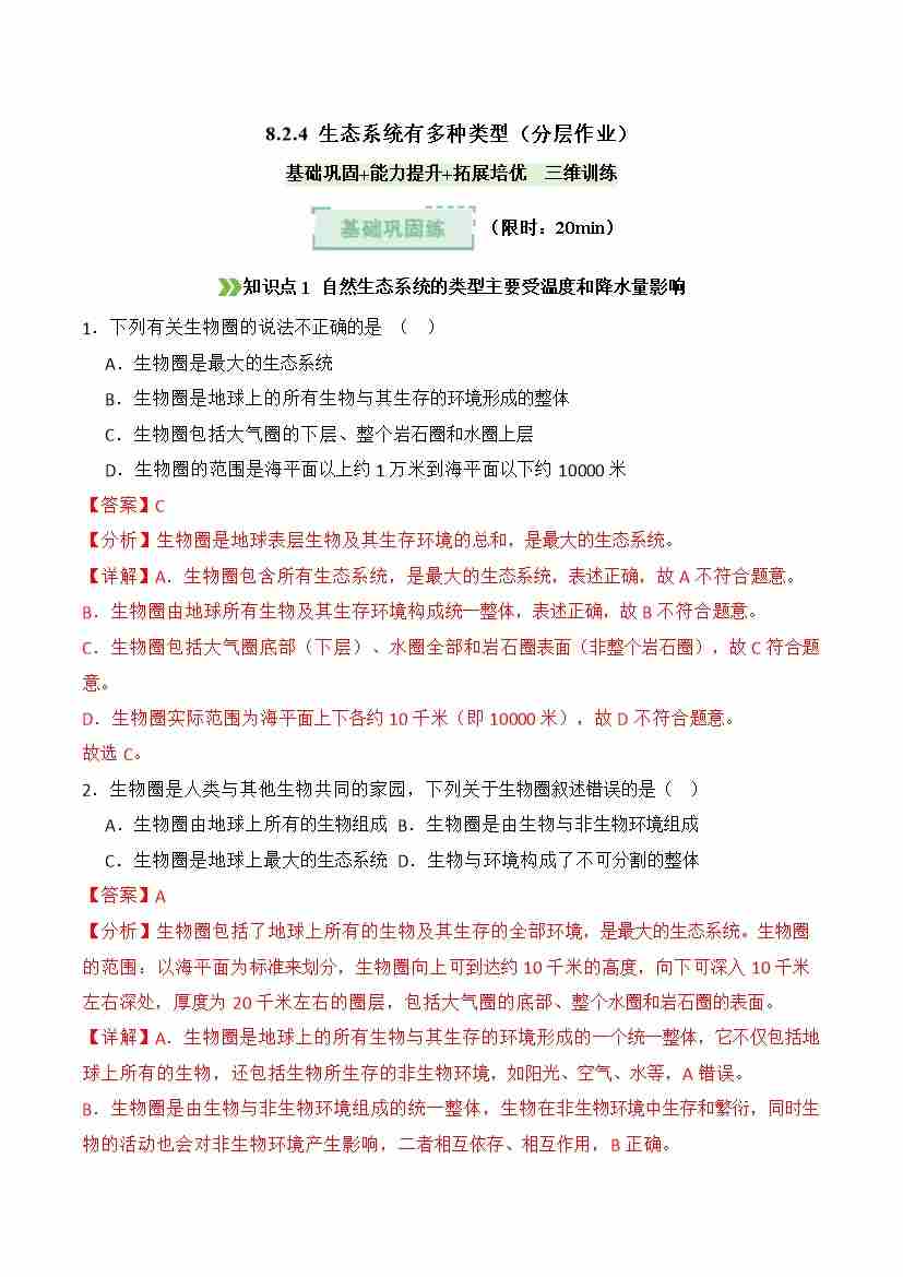 8.2.4 生态系统有多种类型(分层作业)(解析版)