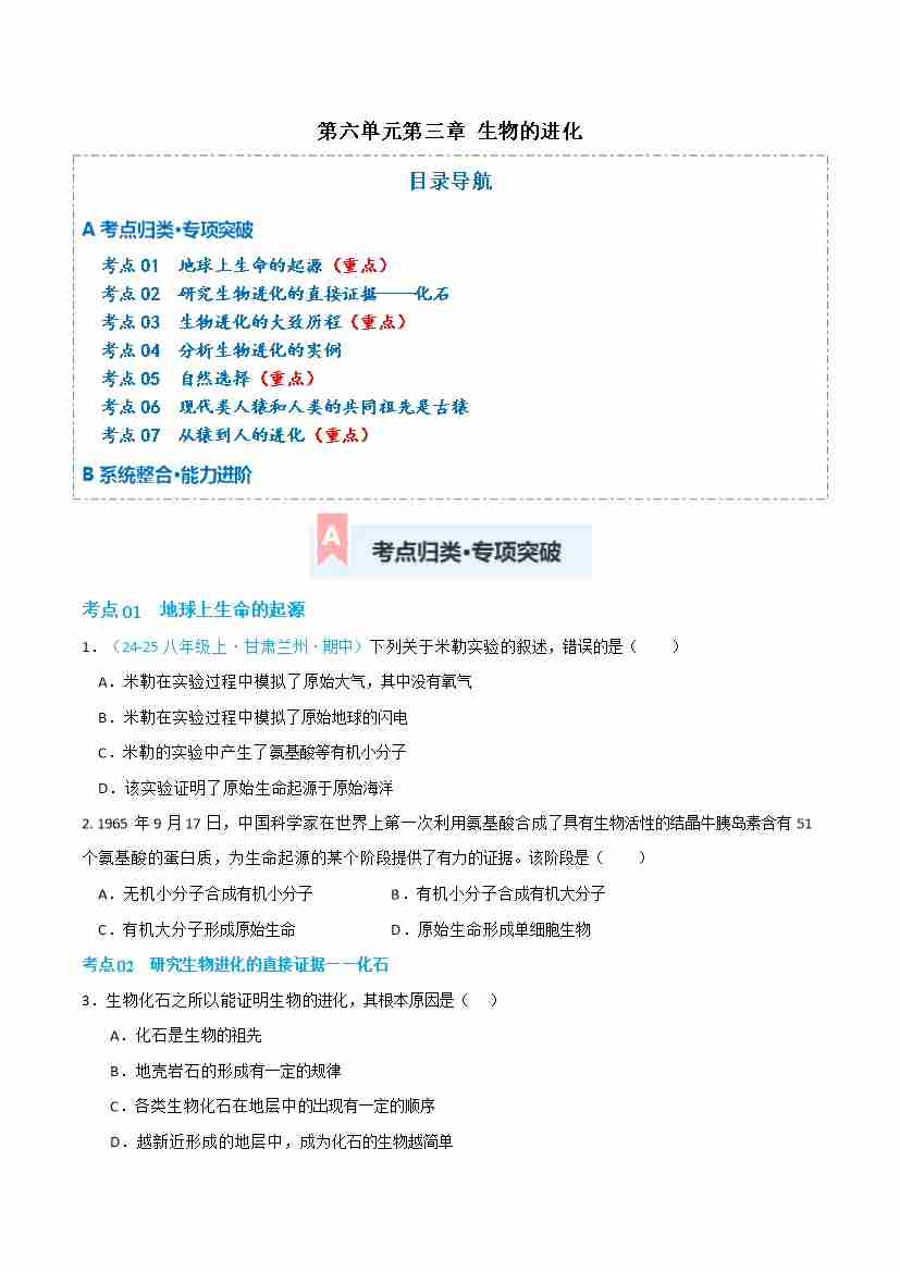 第六单元第三章 生物的进化(专项训练)(原卷版)