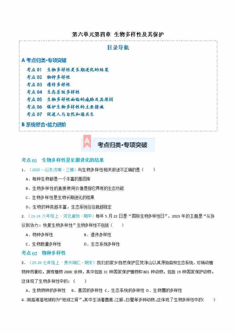 第六单元第四章 生物多样性及其保护(专项训练)(原卷版)