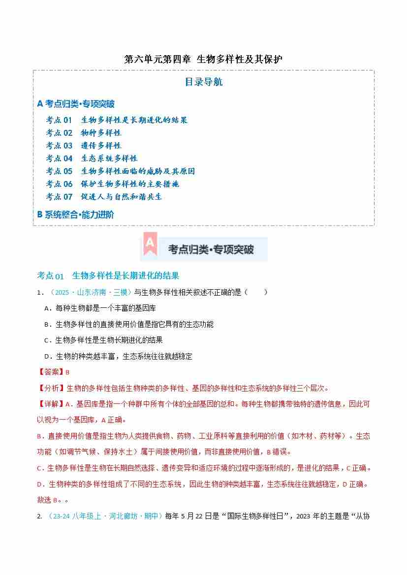 第六单元第四章 生物多样性及其保护(专项训练)(解析版)