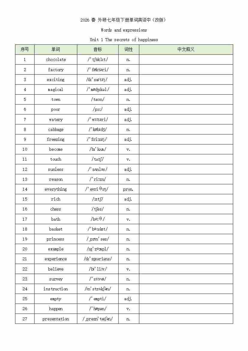 2026 春 外研七年级下册单词英译中(改版)word