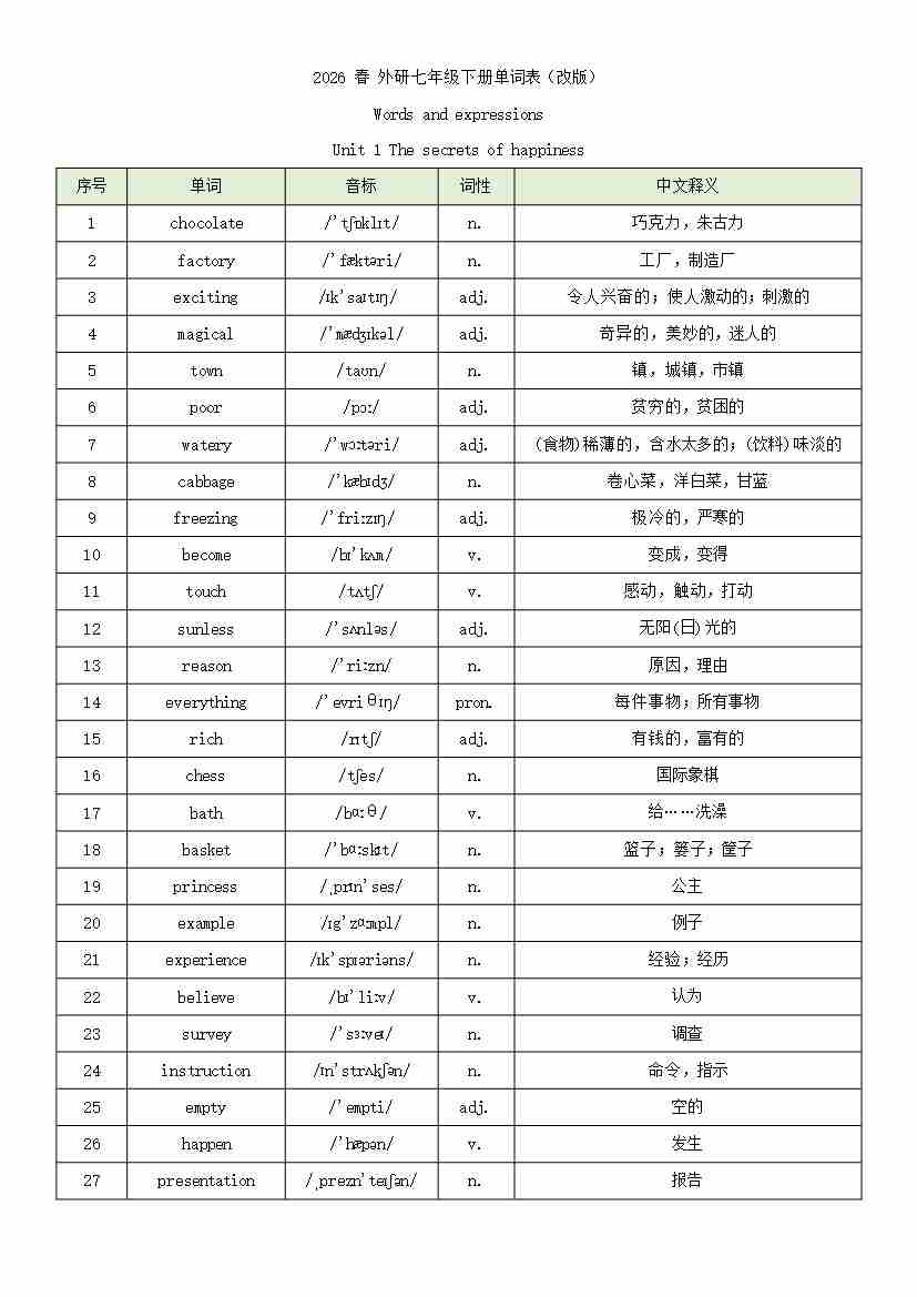 2026 春 外研七年级下册单词表(改版)word