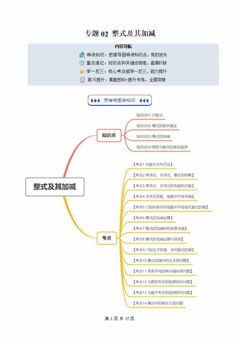 ①寒假复习-专题02 整式及其加减(4大知识点14大考点复习提升)(学生版)-2026年七年级数学寒假衔接讲练 (北师大版-新教材)