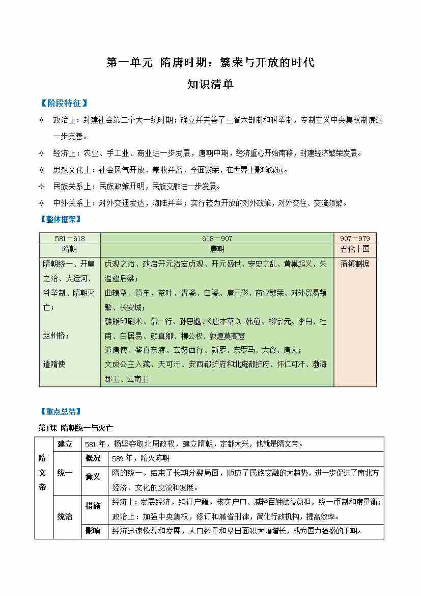 第一单元 隋唐时期:繁荣与开放的时代(知识清单)-(统编版2024)