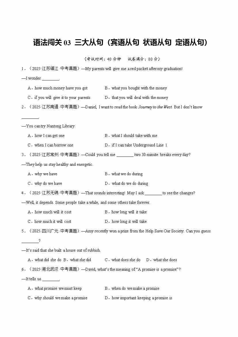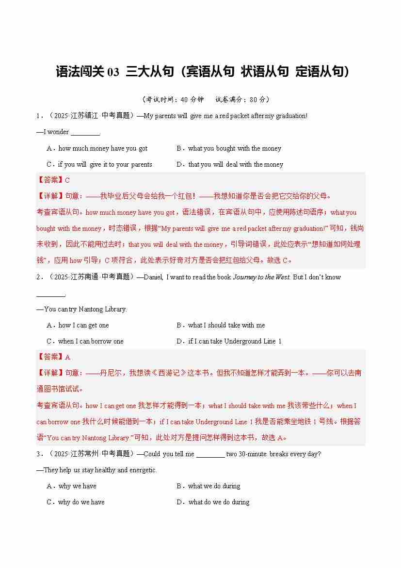 Part 3 词汇语法综合练语法闯关03 三大从句(宾语从句 状语从句 定语从句)(培优综合训练)(全国通用)(原卷版)