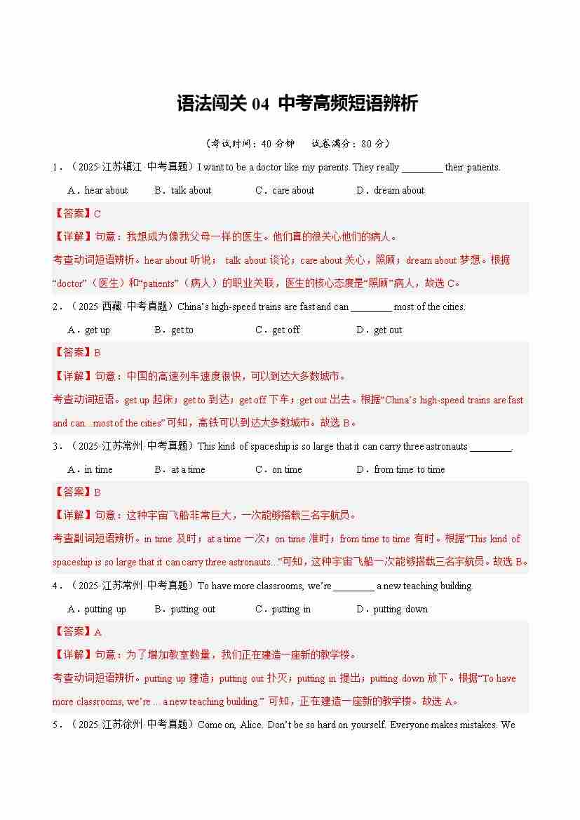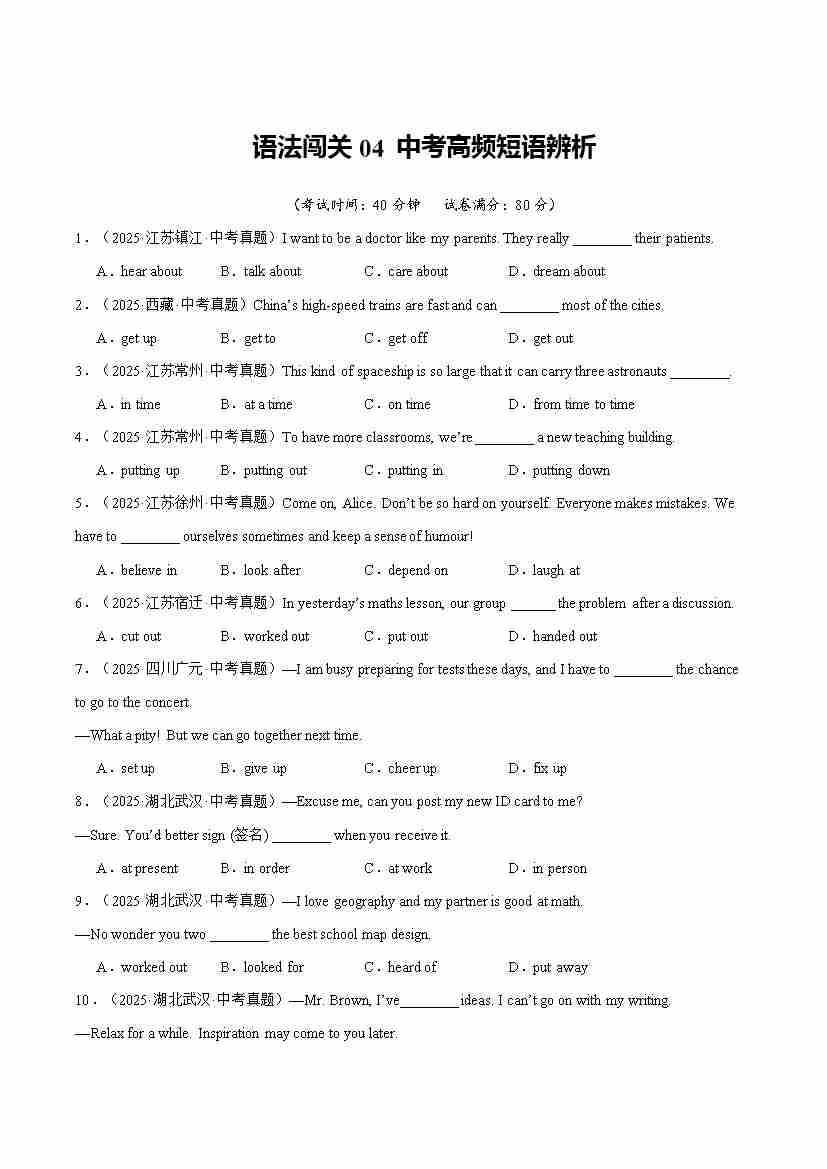 Part 3 词汇语法综合练语法闯关04 中考高频短语辨析(培优综合训练)(全国通用)(原卷版)