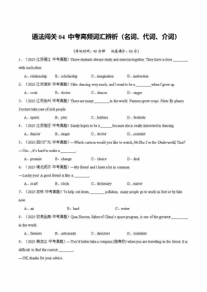 Part 3 词汇语法综合练语法闯关05 中考高频词汇辨析(名词、代词、介词)(培优综合训练)(全国通用)(原卷版)